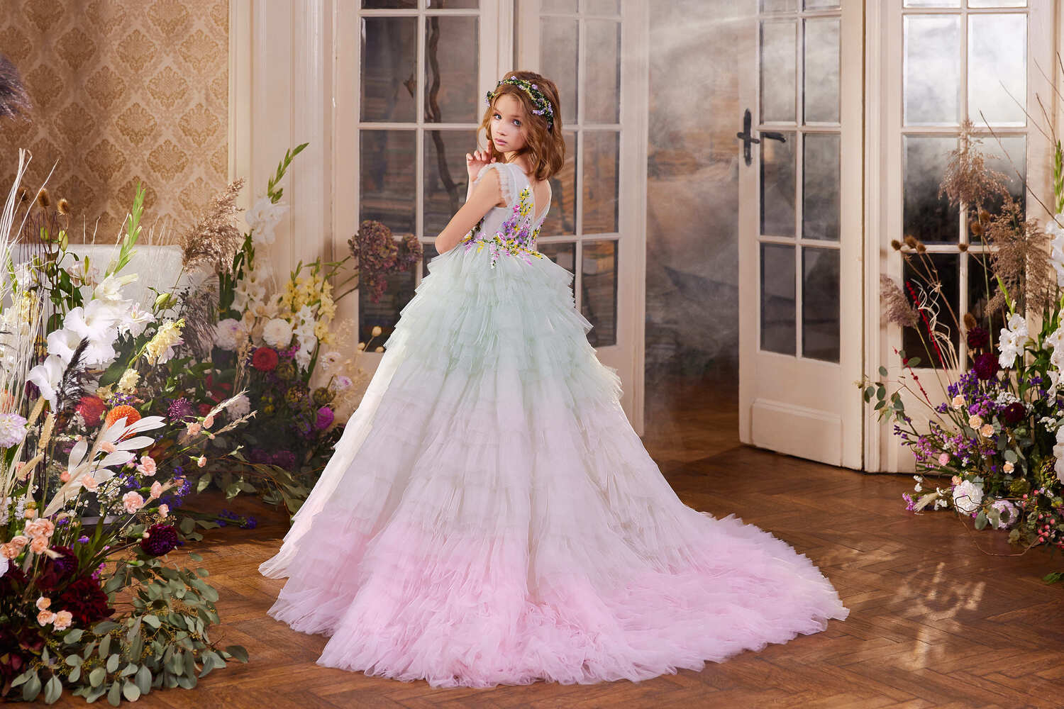 The Los Angeles flower girl dress is a charming choice that will make any little girl feel special on your big day. Featuring a textured lace bodice with short sleeves and a jewel neckline, it is beautifully adorned with pastel flower embroidery, sparkling rhinestones, and delicate beadwork for an elegant touch. The floor-length, full gathered tulle skirt adds a graceful flow, while the chic corset lacing back ensures a perfect fit and adds a sophisticated detail. This dress combines comfort and style, making it ideal for weddings and formal occasions where she will shine as the center of attention.