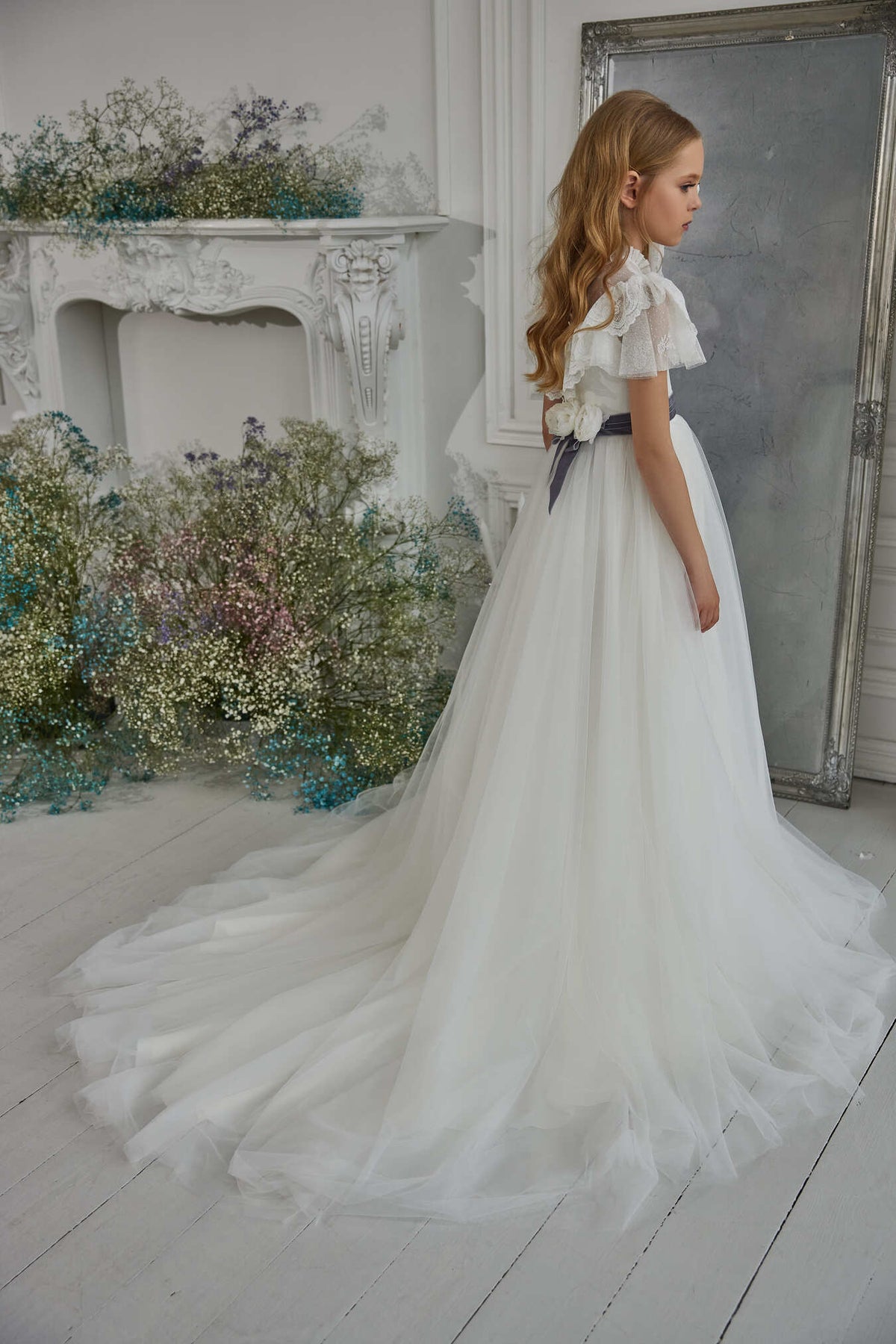 A vintage-inspired square neckline, a frill-trimmed stand-up collar, flowy ruffles framing the shoulder line, and cute butterfly sleeves make this First Communion dress exquisite! It will be her favorite dress for Communion if she adores the ruffles trend as much as we do! In addition, the flowing tulle skirt trailing into a short train adds more excitement.