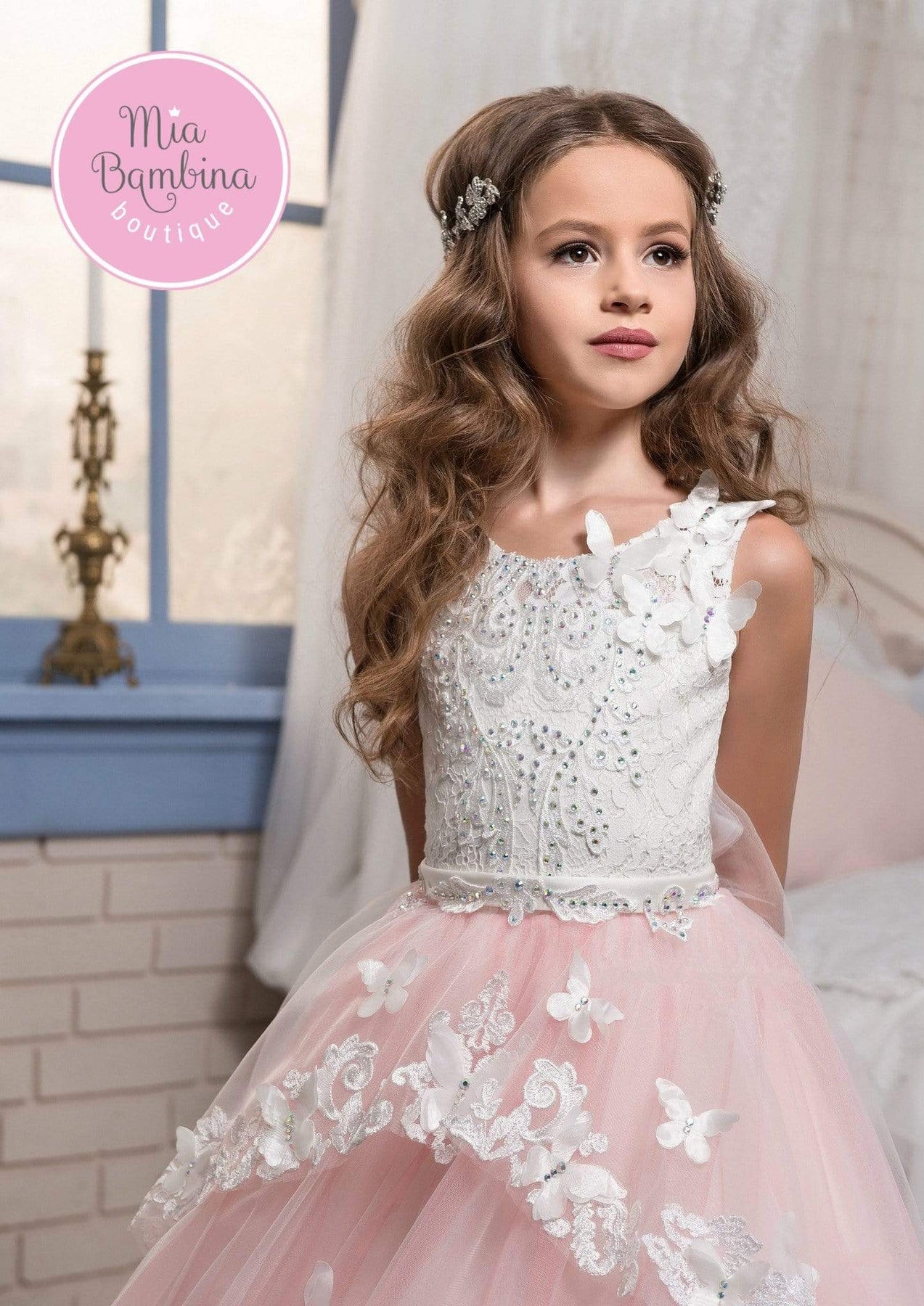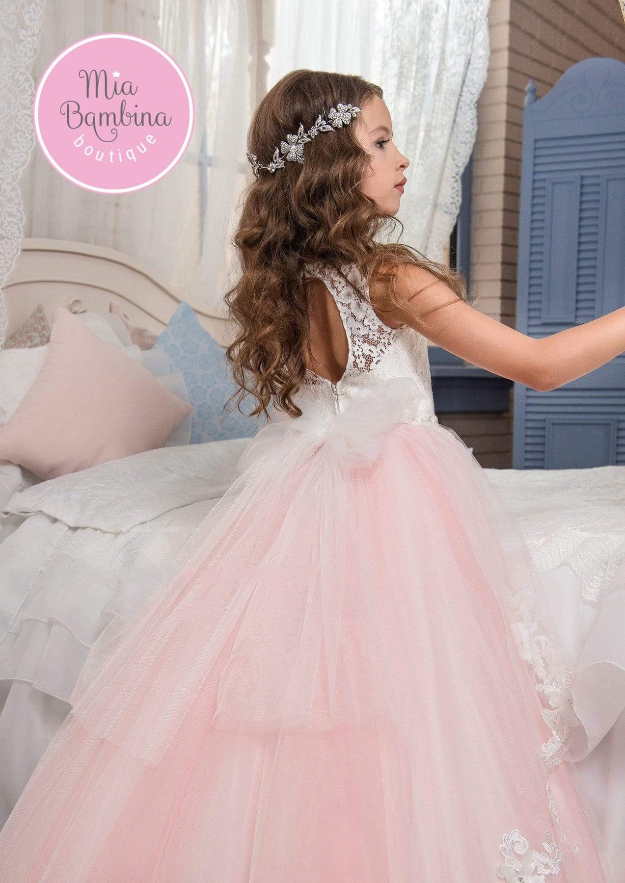 Let your girl live her fairytale fantasy with this magical Ontario flower girl dress. Exquisite lace appliques adorn the fitted bodice and the sheer tulle skirt with its overskirt detail. The outer layer is made of tulle and the lining is made of satin.