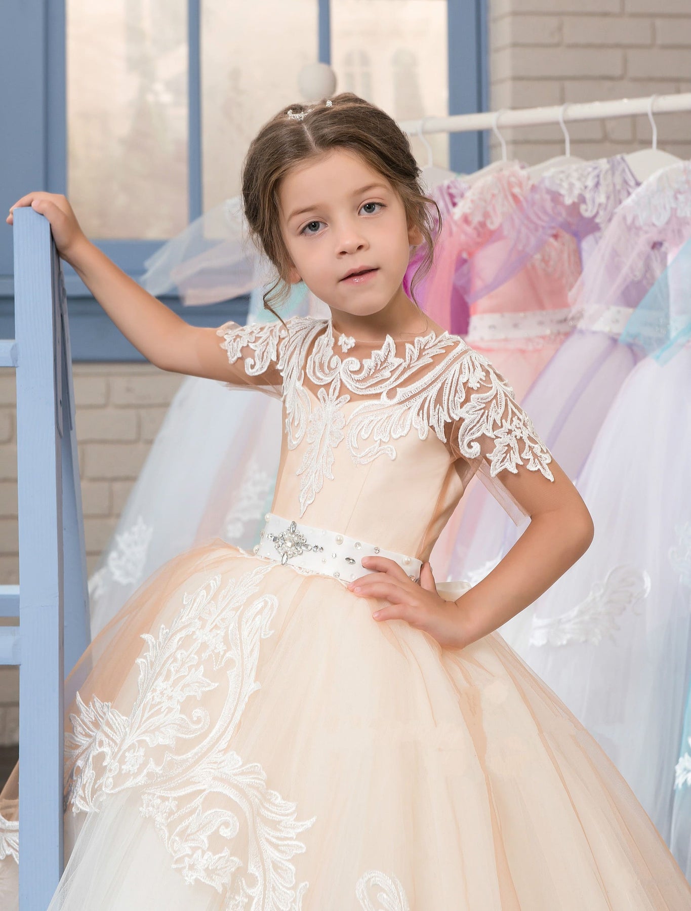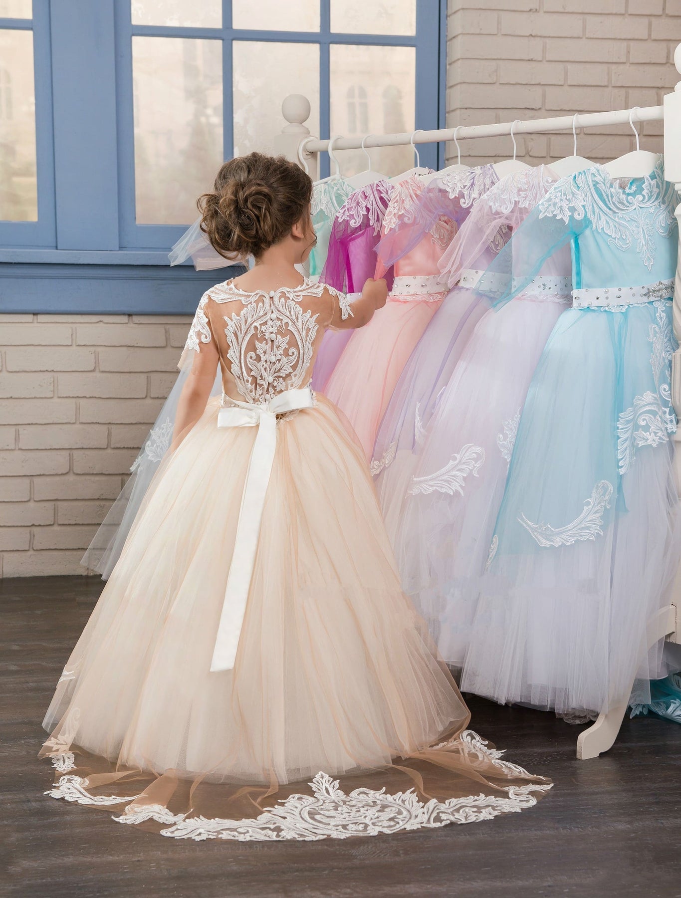 The gentle and wonderful Augusta flower girl ball gown is the little princess's dream dress. A white fitted sweetheart bodice with lace straps sleeves and a puffy, contrasting, colored skirt with train, are the main eye-poppers of this beautiful dress. This flower girl dress will get lots of compliments on the wedding day. It has a back lacing corset and a zipper closure. The sleeveless bodice waistline is accented with a little front bow.